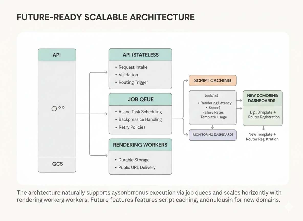 The architecture naturally supports asynchronous execution via job queues. Rendering workers can be scaled horizontally. Script caching could eliminate redundant regeneration for popular topics. Monitoring dashboards could track rendering latency, script failure rates, and template usage distribution.